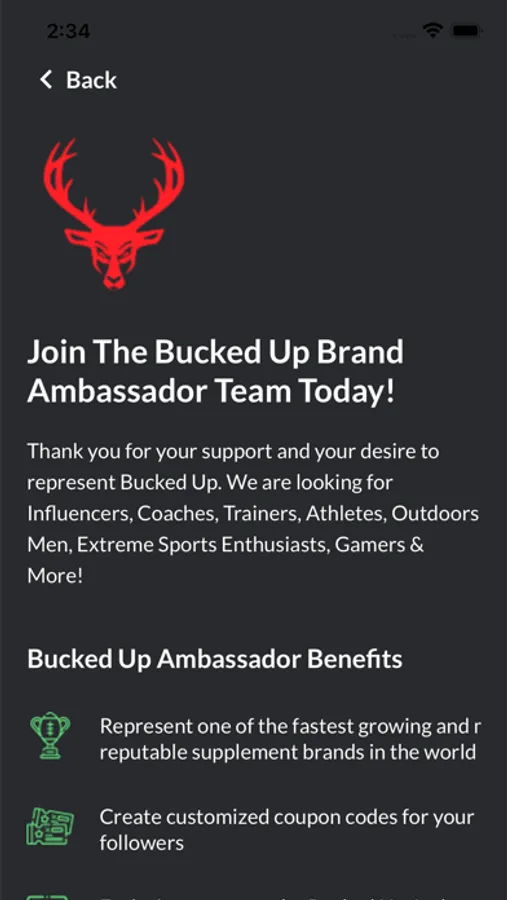 Approved to be a Bucked Up Ambassador? Download the Bucked Up Ambassador app to get started today or visit https://www.buckedup.com/ambassador/register to apply now.
