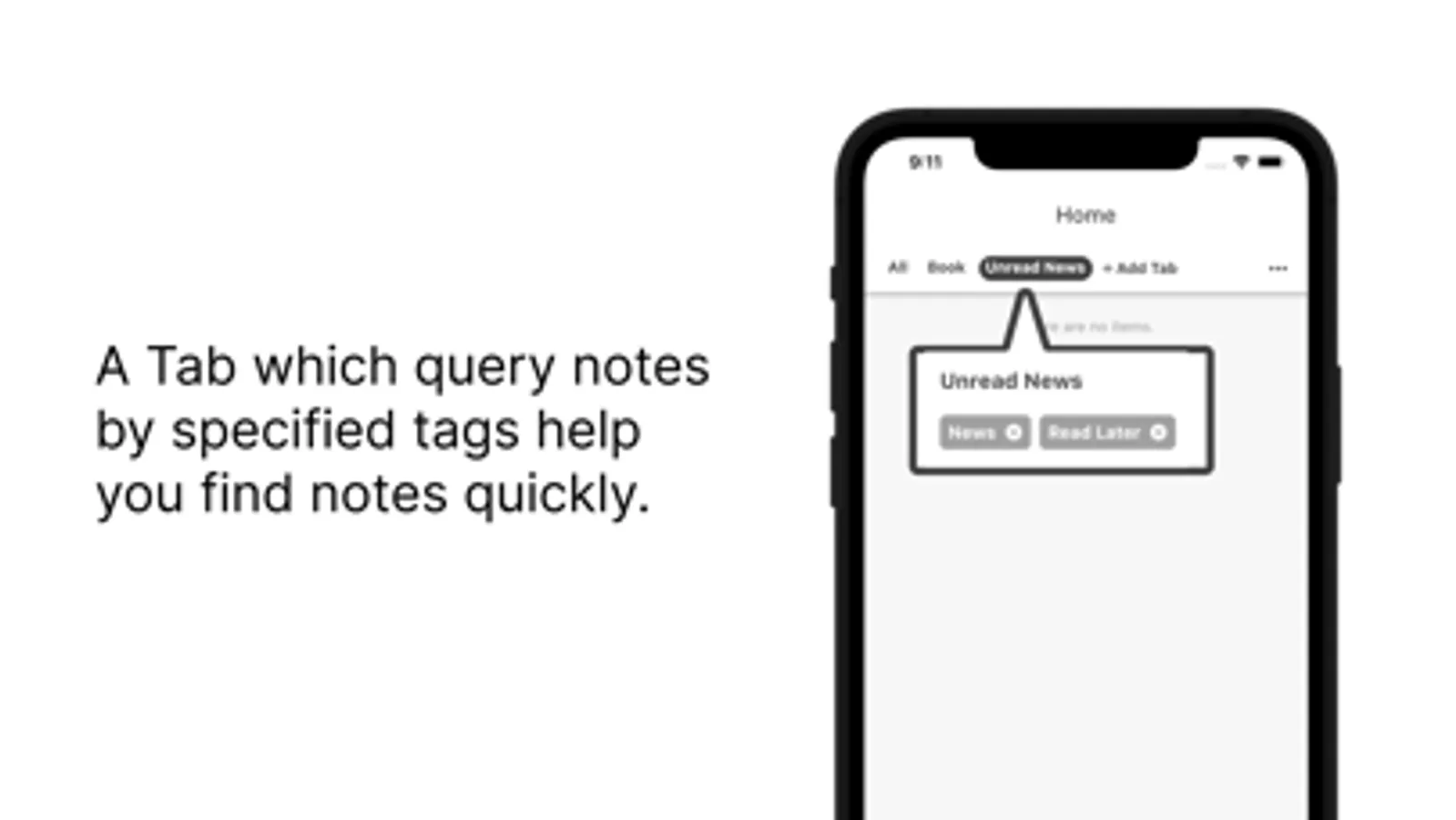 You can create a custom tab by specifying tags to filter the note (multiple tags can be specified). Custom tabs can be used on the home screen. For example, if you create a custom tab filter your notes by the "Ideas" tag, only the "Ideas" notes will be displayed in the "Ideas" custom tab on the home screen. It is convenient to create a custom tab for tags that you review frequently.
