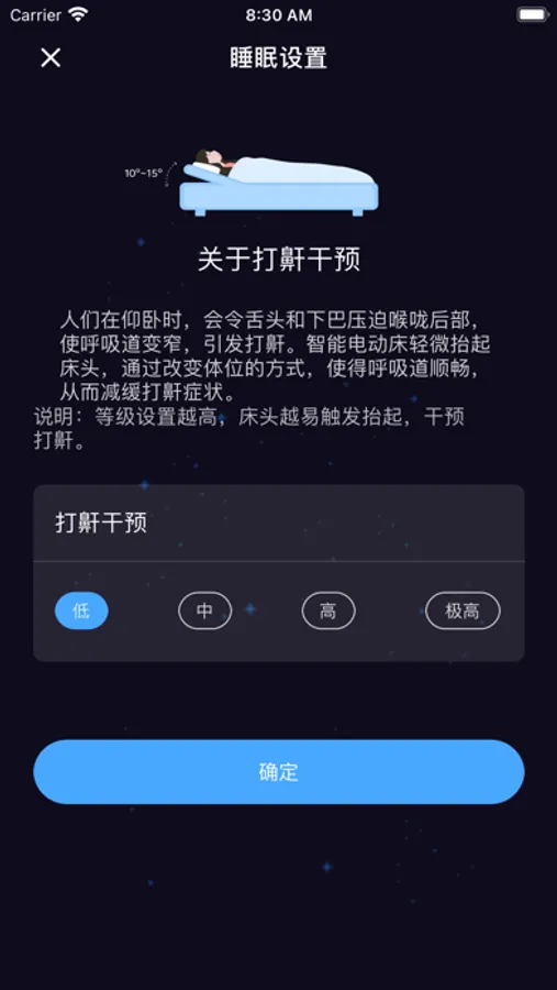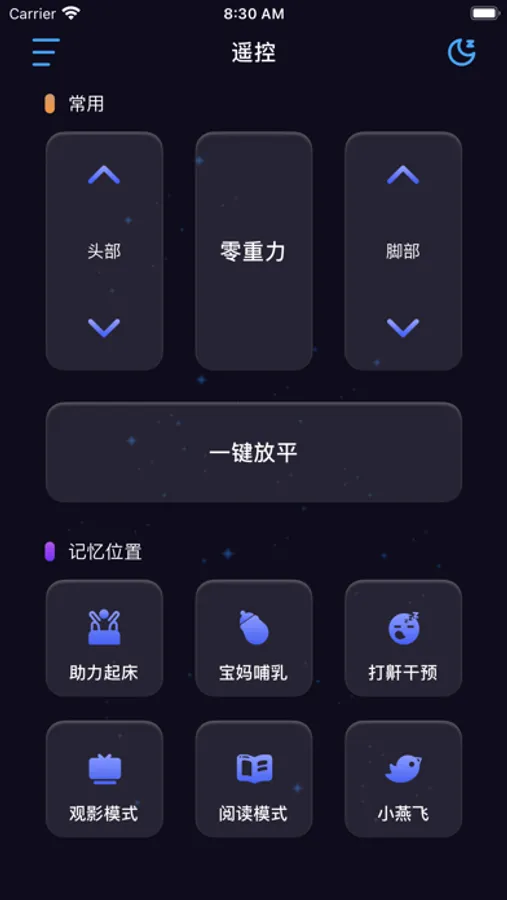 舒眠吧App,通过简单的蓝牙连接方式,带您一起体验索菲莉尔智能电动床所适应的不同睡眠场景。清晨:助力起床;宝妈:舒适的哺乳角度;打呼大户:合适的打鼾干预角度;睡前:阅读、观影模式;床上瑜伽:小燕飞角度。