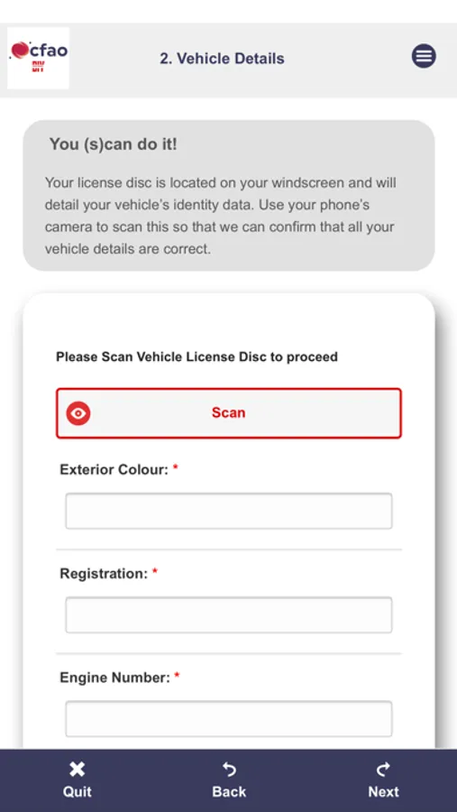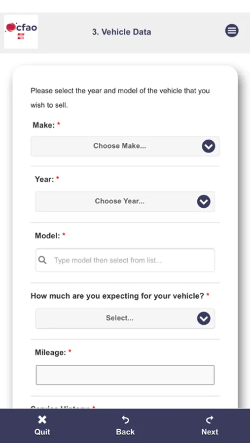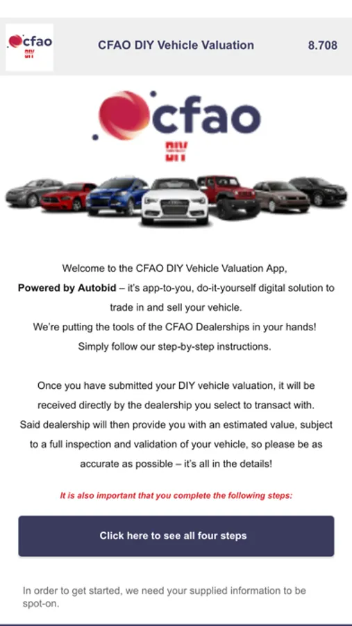 DIY valuation app for CFAO vehicle dealerships. Allows customers to remotely send their vehicle valuation. Powered by Autobid (PTY) Ltd