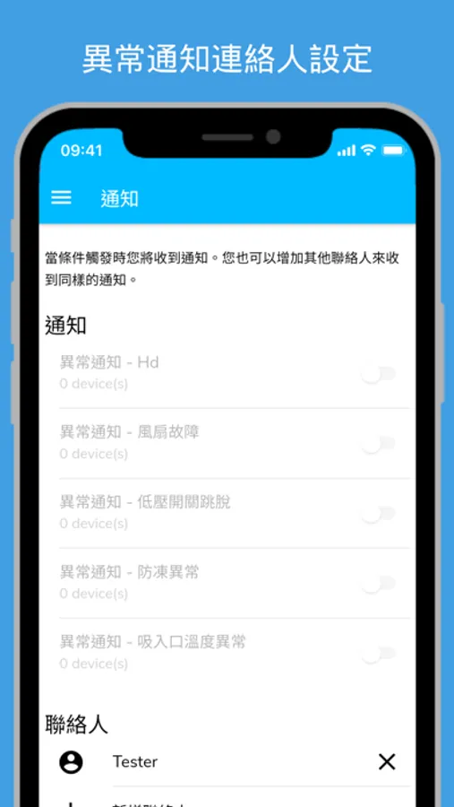 通知功能: 設定通知連絡人,當設備異常時,該連絡人可收到通知email。