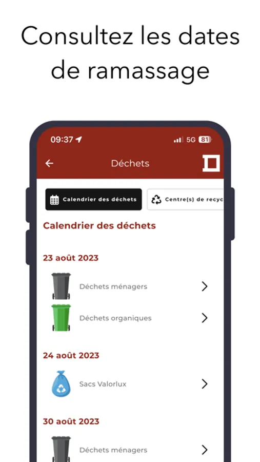 - Accédez aux dates des ramassages des déchets et recevez une notification pour vous rappeler de sortir les poubelles