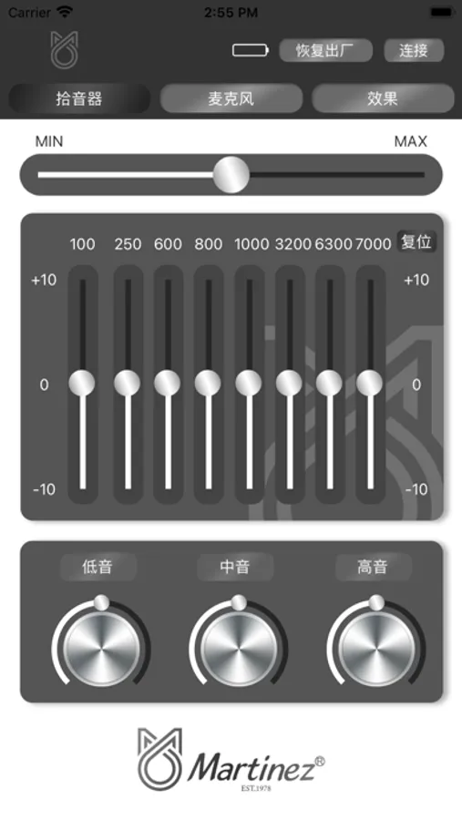 用这款APP通过蓝牙连接对应的拾音器之后,可以远程调节的拾音器。有拾音器、麦克风音量调音,而且还各有多路均衡值调节。效果页面可以调节合唱、延时、混响等效果,还有相互的组合效果。