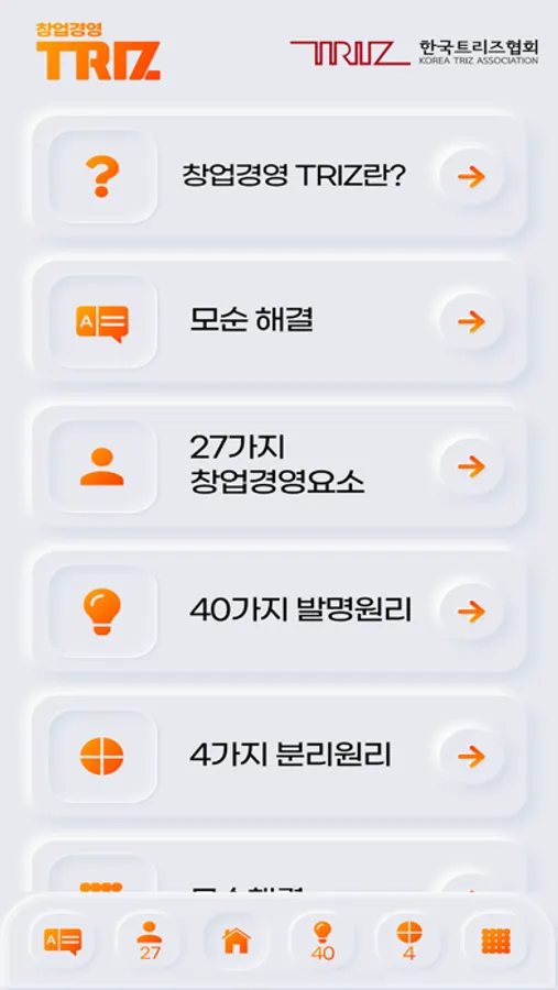 창업경영 기획자 및 개발자가 필요한 역량을 향상시켜주는 창업경영분야의 트리즈 앱입니다.