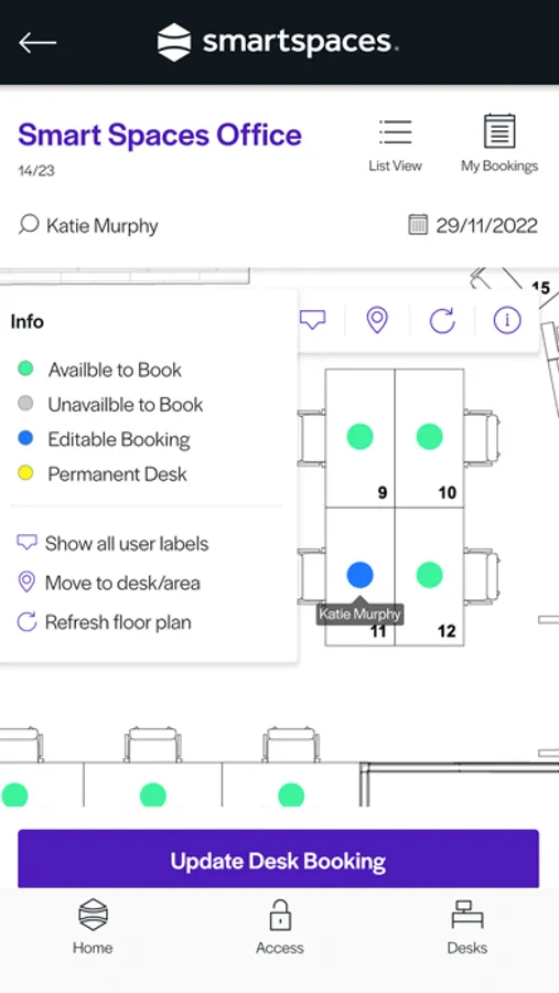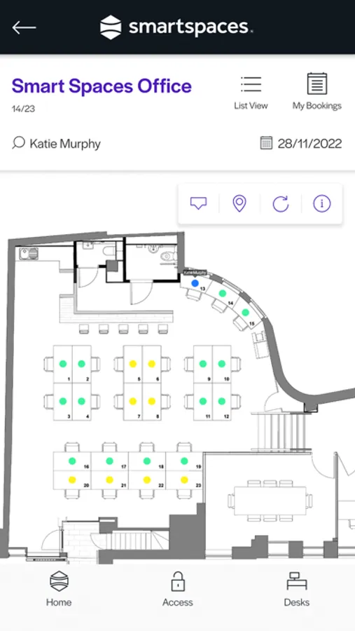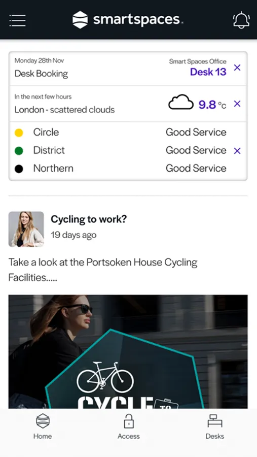 The Smart Spaces Experience keeps you in touch with your colleagues and working community. Access to social features through a scrollable Social Wall keeps you up to date with the latest workplace news, the in-app desk booker allows you to book a workstation and the in-app virtual card facilitates access to your work space.