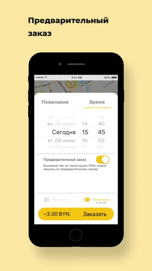 Выберите опцию “Предварительный заказ”. Поиск автомобиля начнется незадолго до заказа поездки, и автомобиль приедет к назначенному времени. Также вы будете заранее знать стоимость поездки.
