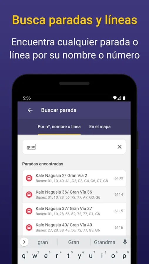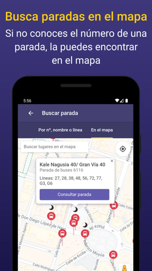 - Puedes buscar paradas por su nombre o número, o seleccionarlas en el mapa.