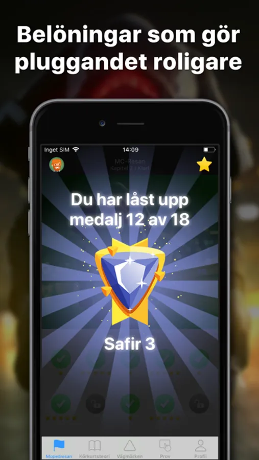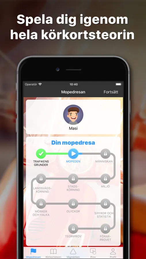 Med iKörkort Moped kan du spela dig igenom hela teoriutbildningen med det pedagogiska spelet Mopedresan. Spelet består av korta teorilektioner, vägmärkesnivåer och olika typer av prov. Under spelets gång samlar du stjärnor och låser upp medaljer. När du har klarat spelet har du all den kunskap du behöver för att bli godkänd på det riktiga teoriprovet!