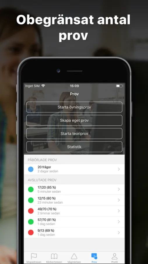 • Fem olika typer av prov: smarta övningsprov, teoriprov, vägmärkesprov, ämnesprov och egna prov där du själv väljer alla inställningar.