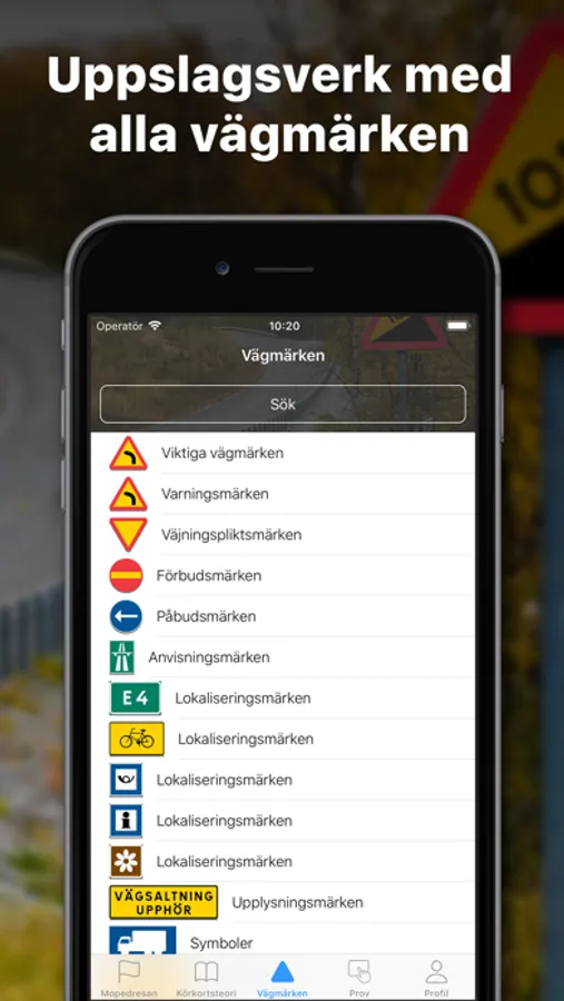 • Sökbart uppslagsverk med alla Sveriges vägmärken, där du även kan spara vägmärken för att enkelt kunna repetera de vägmärken du har svårt för.