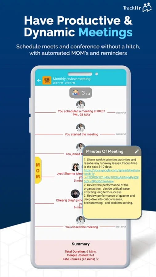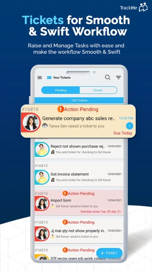 TrackHr as a platform, combines the functionality of an easy one click Key Responsibility Area (KRA) allocation , trouble ticket creation & monitoring , team meeting planner and right-on-time reminders and alerts to each resource to cut on the communication delays and gaps in the organisation. No need to invest time into texting ,calling or personally communicating the work any more, but investing more time into focusing on doing the work.