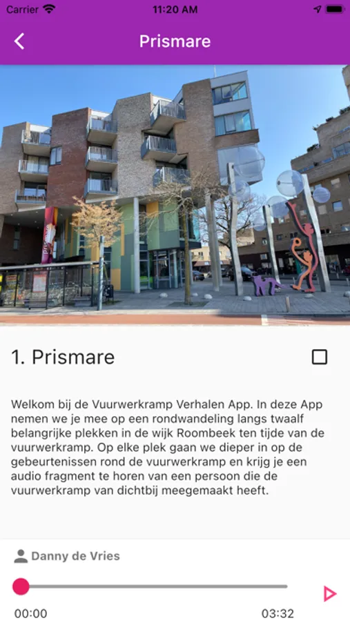Door middel van GPS kan je zelfstandig een audio tour lopen door Roombeek en daarbij mee te weten komen over de vuurwerk ramp die op 13 Mei 2000 plaatsvond.