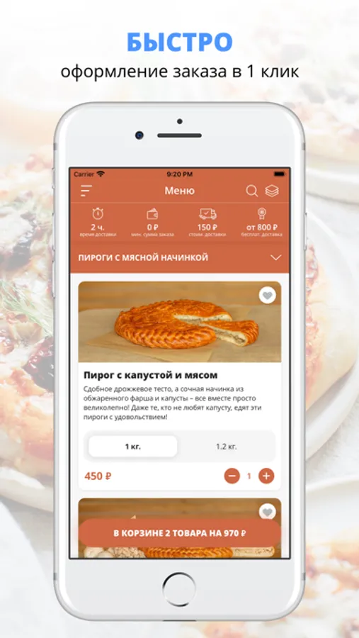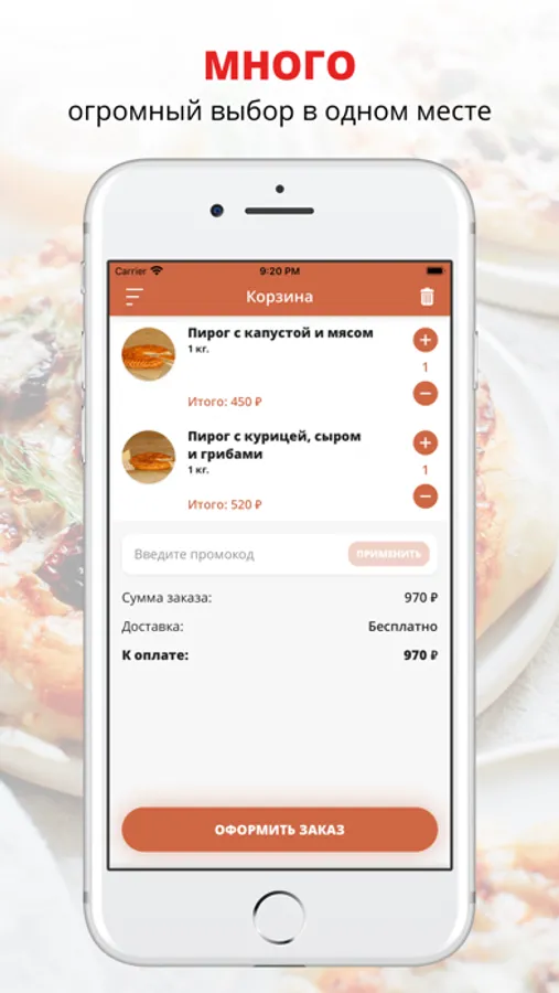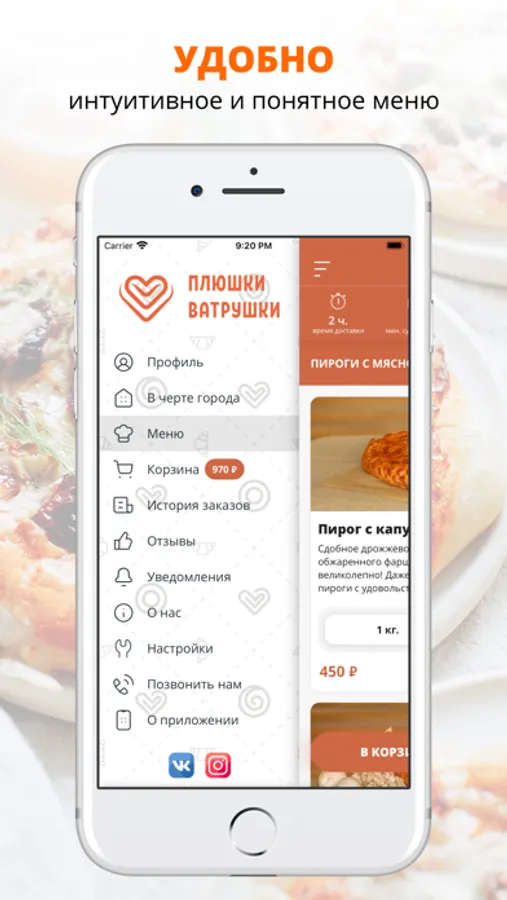 Функционал приложения: меню, удобная корзина и быстрое оформление заказа, выбор города и зоны доставки, выбор способа оплаты, личный кабинет с историей заказов, бонусы за регистрацию, промокоды, скидки, акции, уведомления о статусе заказа.