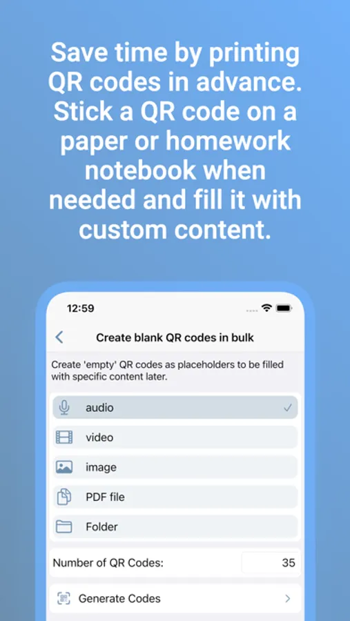 You can generate up to 30 placeholder QR codes at once for all possible feedback types directly in hyFee and save them in a PDF file. This way you can print the codes collected on one page, cut them out and keep them in stock.