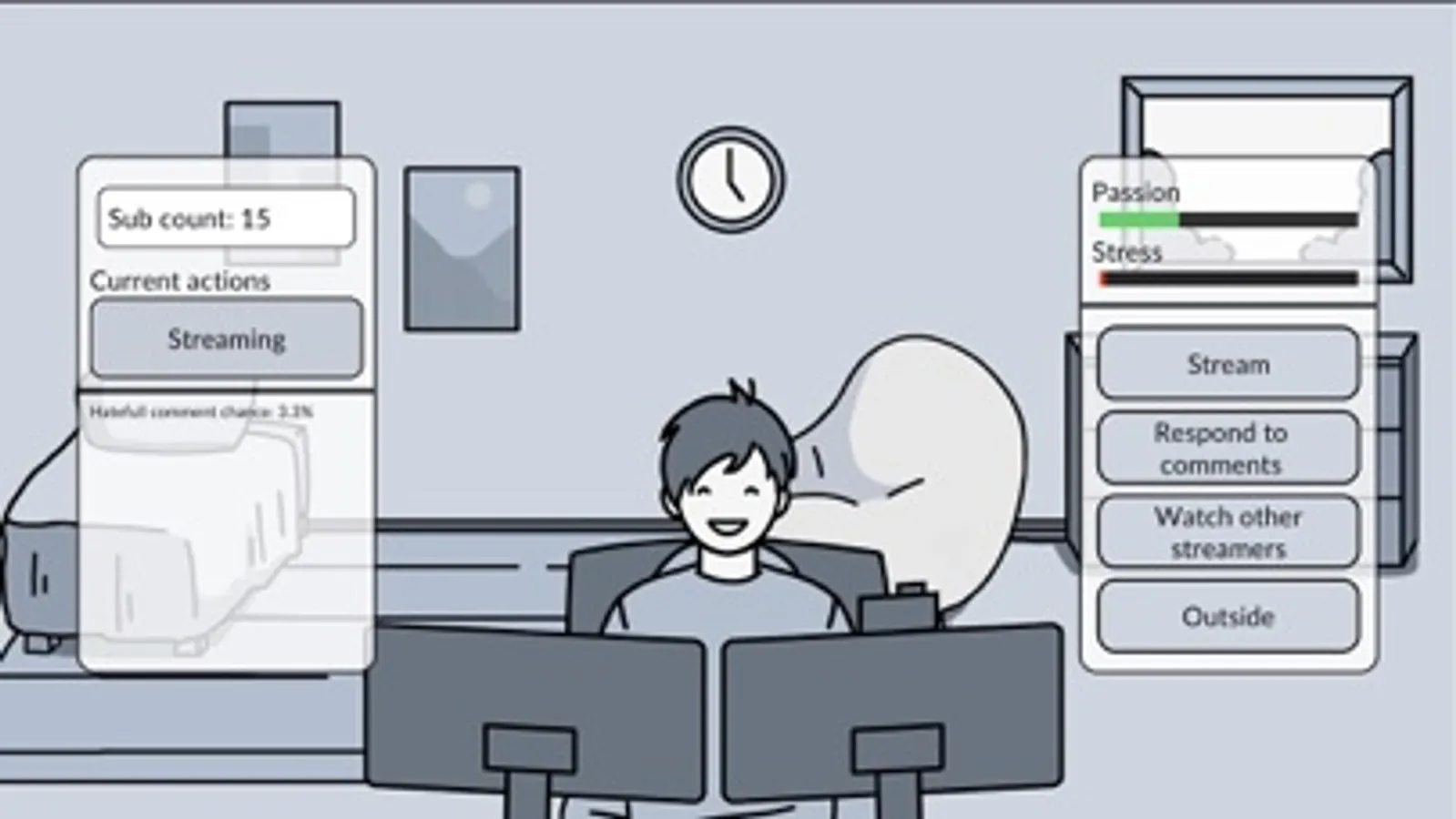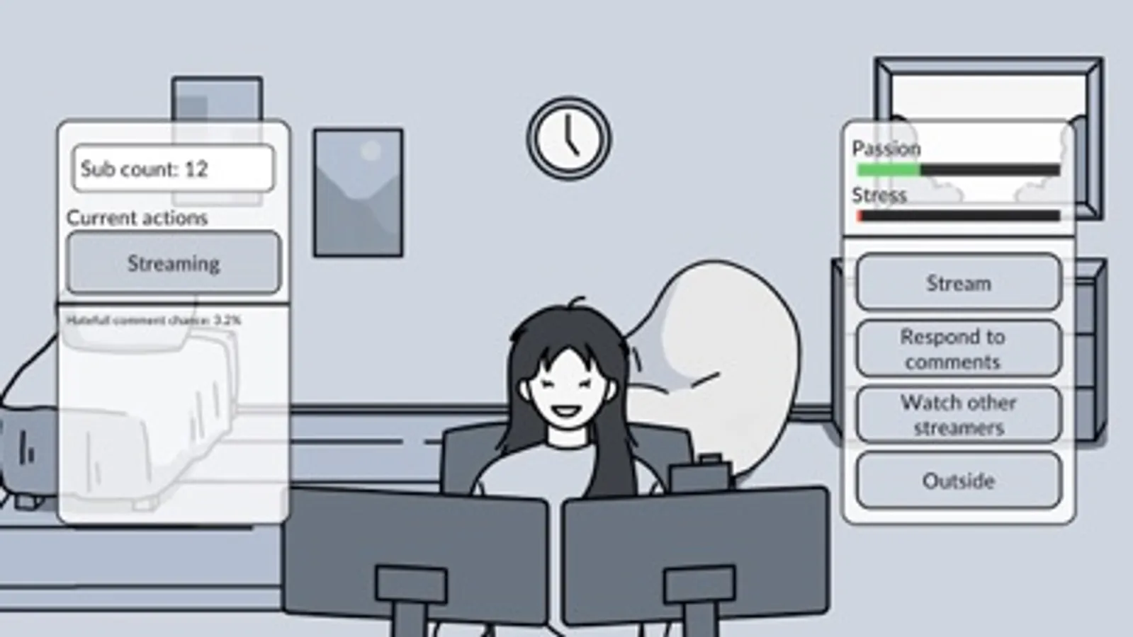 In the game, you take the role of a YouTube streamer. Your goal is to keep a balance in your life, between building your subscriber base and keeping a civil discussion in the comments, all while maintaining your psychological stability.