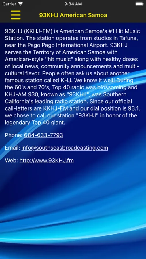 Listen to 93KHJ radio and Talanei news in American Samoa. It's American Samoa's Best Music Mix - right on your phone or tablet. See a schedule of your favorite radio personalities as well as the title and artist information for every song we play. You can also listen to our sister stations V103 (WVUV) and 104.7 The Beat (KKBT).