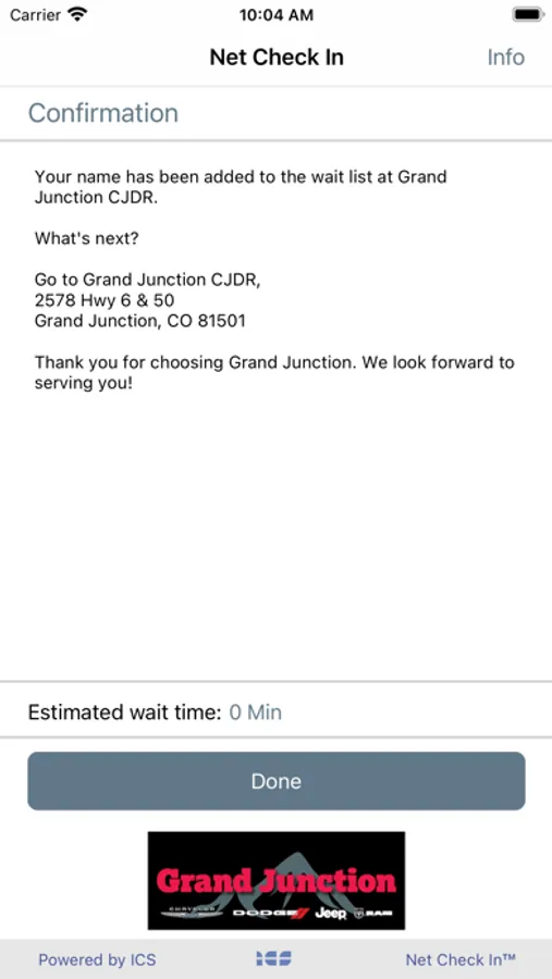 Getting your auto serviced at Grand Junction Chrysler Jeep Dodge RAM is now easier than ever. Let your name wait for you, while you do more important things. Grand Junction Chrysler Jeep Dodge RAM utilizes ICS Net Check In™ to allow you to check in for a service using your phone, iPad or via the web.