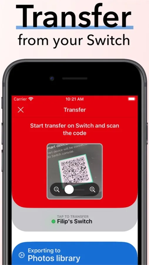 Scan just the first QR code to transfer from your Switch console. You can transfer up to ten screenshots or a single video. Select Photos or iCloud Drive as the export destination. Are you playing on a TV? No problem; with zoom, you can comfortably scan the needed QR code from your sofa.