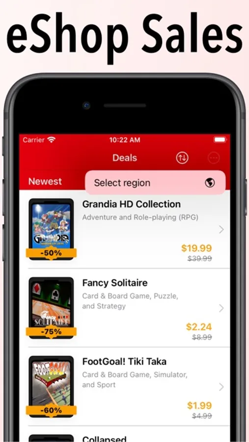 Easily see game prices, current deals, and wishlist games to be notified about price drops. You can also change eShop region to view prices for different countries.