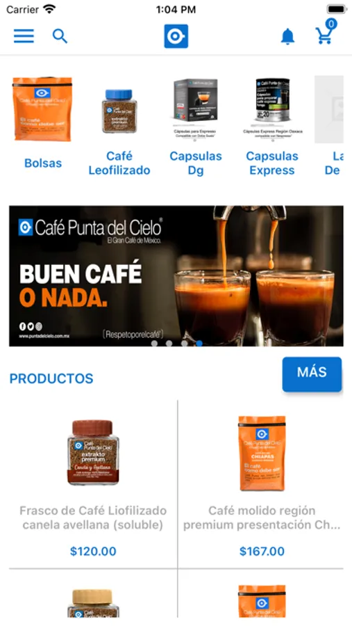 Navega de manera fácil encontrando nuestros productos por categorías (café a granel, cápsulas compatibles con otros sistemas, latas de café molido, café con diferentes sabores, café liolifilzado entre otros.)