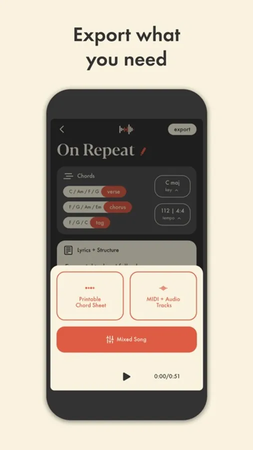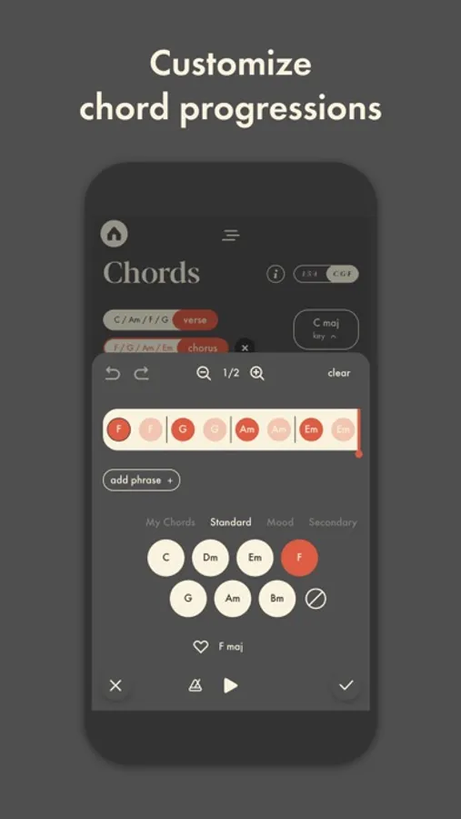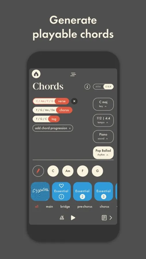 • Generate playable chords: Build your own or try pre-built progressions with a single tap