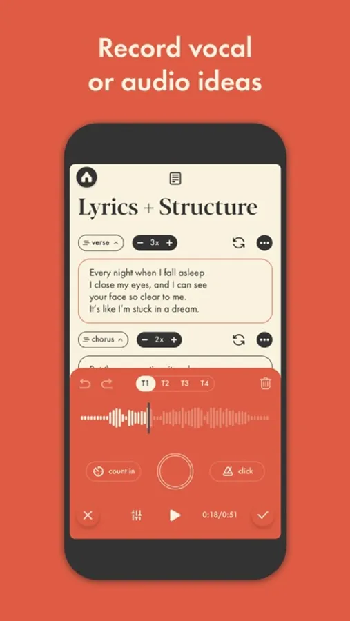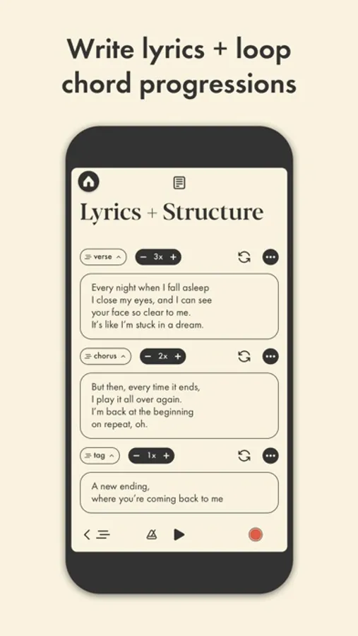 • Write + build: Write lyrics and loop progressions to build the backbone of your song