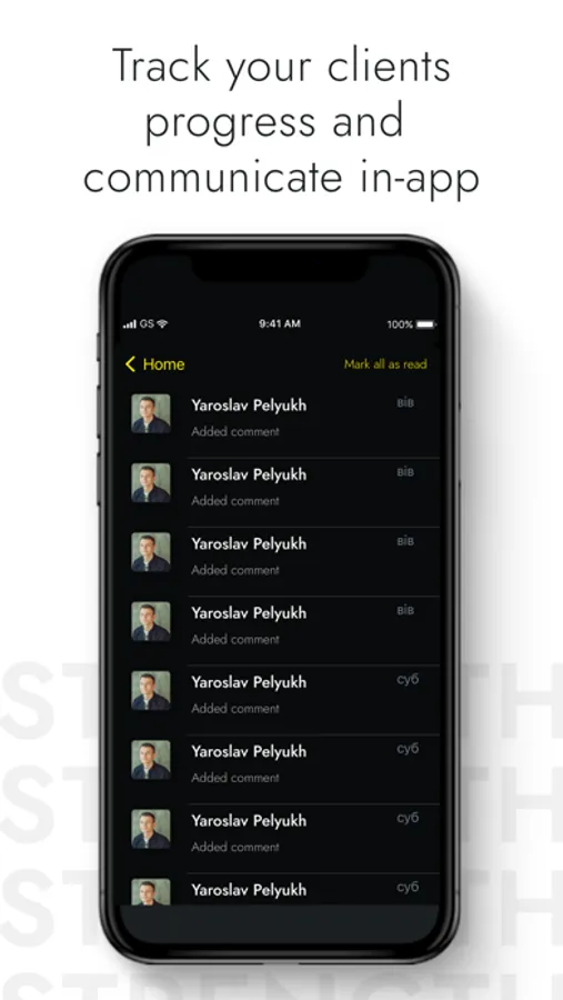 This app also allows coaches to monitor their clients progress, communicate with their clients, and help achieve results - from their smartphones, anytime, anywhere.
