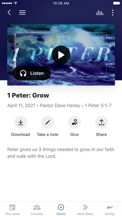 This app will help you stay connected with the day-to-day life of our church. With this app you can: watch or listen to past messages; stay up to date with push notifications; share your favorite messages via Twitter, Facebook, or email; and download messages for offline listening.