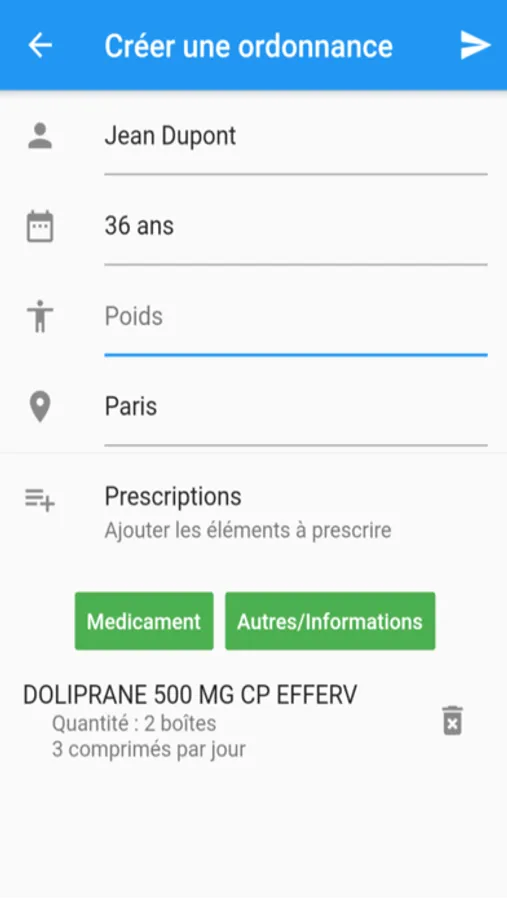 - En quelques clics, spécifiés les informations du patient que vous souhaitez faire apparaitre sur l'ordonnance : nom, âge, poids