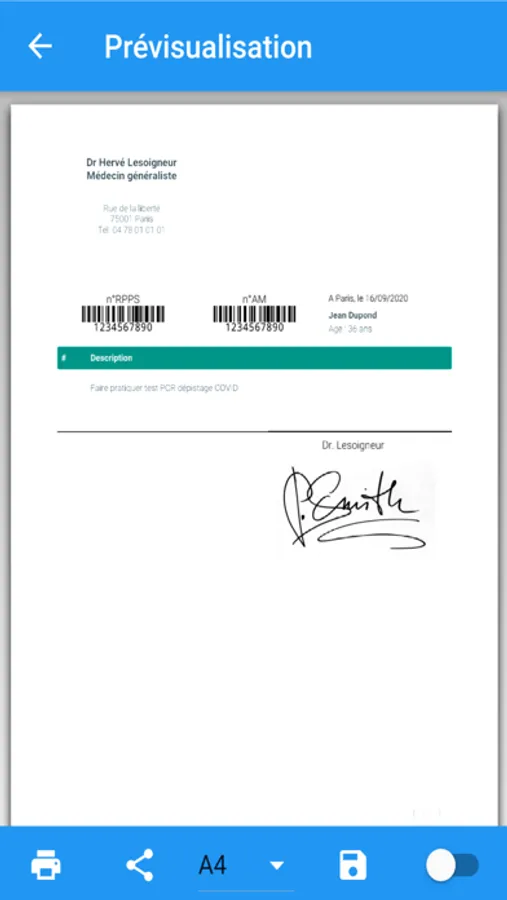L'ordonnance est généré sous format PDF et peut être envoyé directement depuis le téléphone à la pharmacie ou au patient.