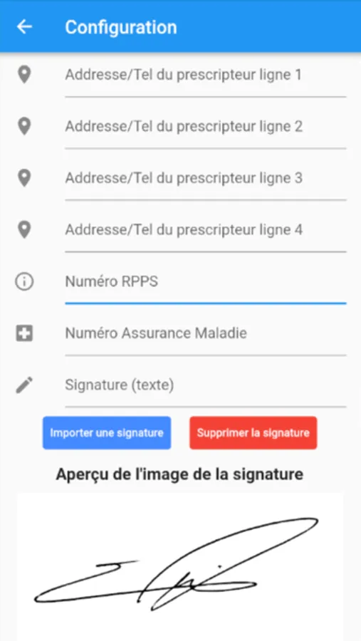 - Configurer vos informations en tant que prescripteur : nom, adresse, cabinet, numéro de téléphone ou site web, créer votre modèle d'ordonnance à votre convenance