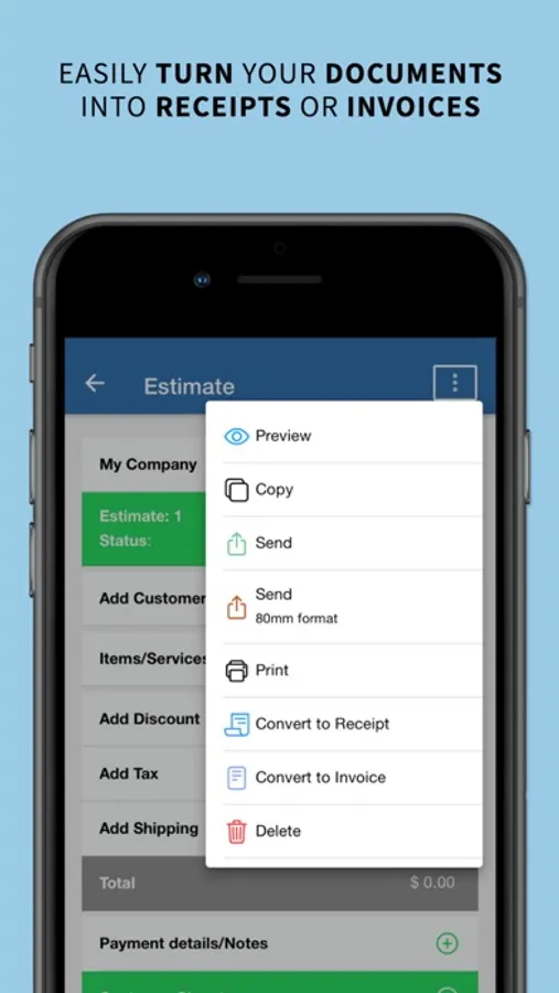 Create and send receipts, invoices, estimates and credit notes of services and products.