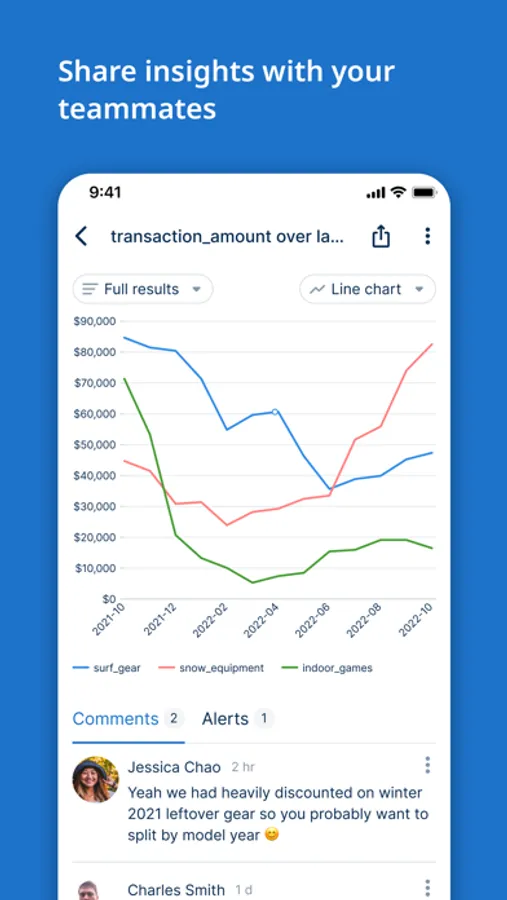 Built in messaging functionality lets you share visualizations and questions with your teammates, use @mentions with colleagues to get their insights, get decisions made quickly. They'll get an email when you mention them.
