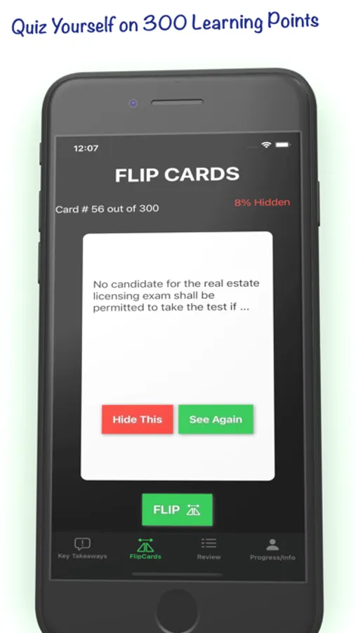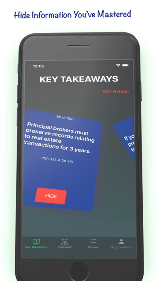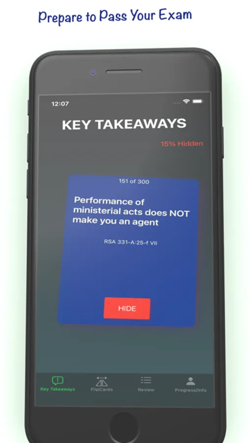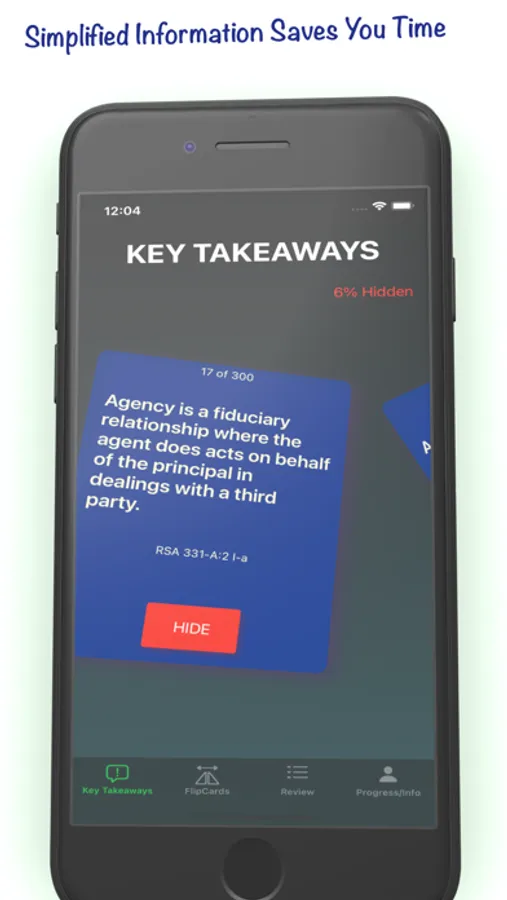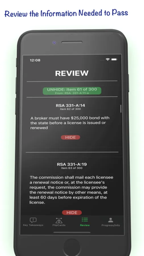 Review: Each learning point is written is a way that is somewhat shorter and more comprehendible than the Laws/Rules from which they are taken. Each item can be hidden if you do not believe needs further study. Hiding an Item in review will also hide the flip card, so you are not duplicating efforts.