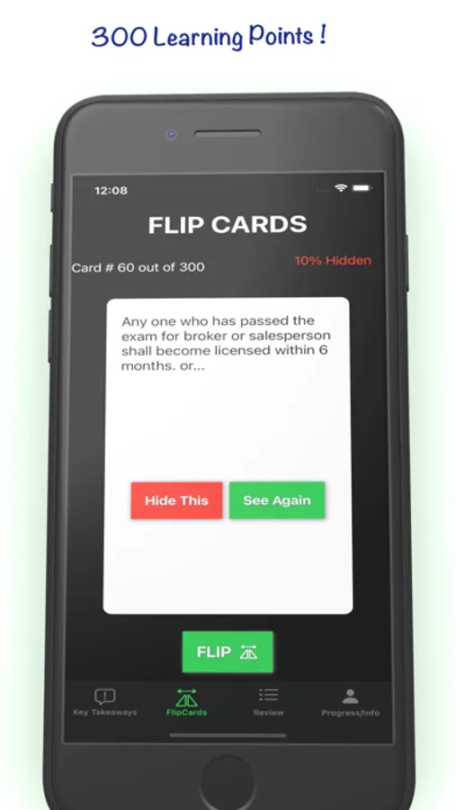 There 300 learning points are each in three different study modes: Key Takeaways, Flip-Cards, Review.