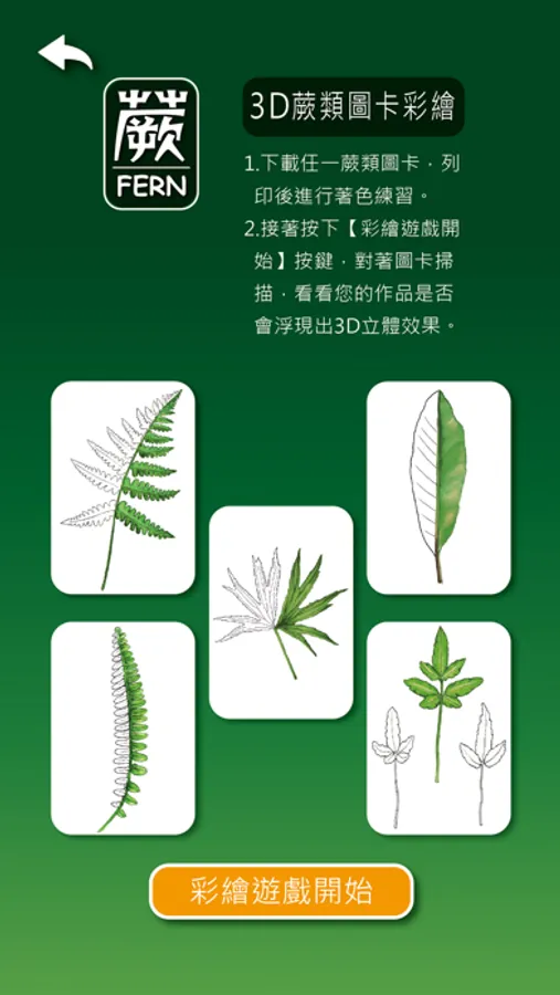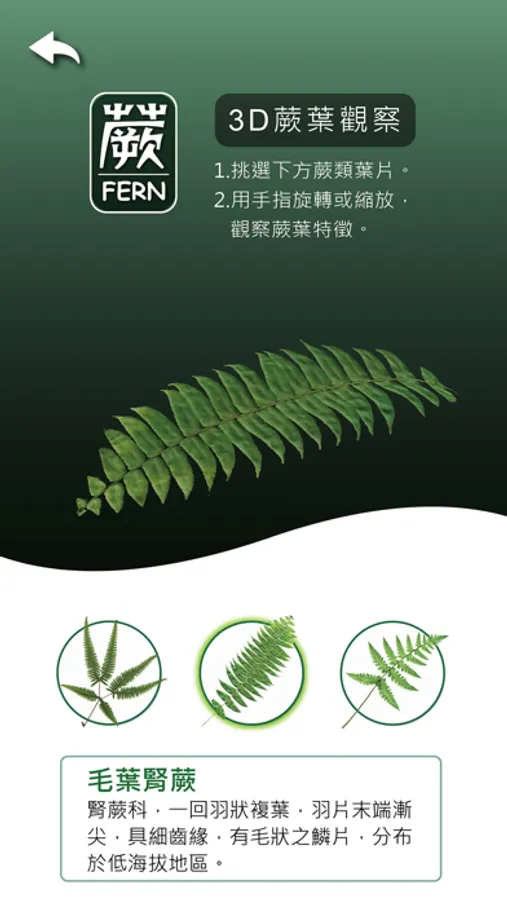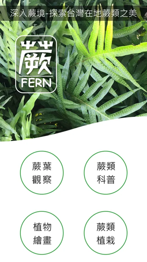 本套APP共計分成「蕨葉觀察」、「蕨類科普」、「植物繪畫」、「蕨類植栽」四大單元,從植物觀察與科學繪圖等不同的視角切入,讓學習者可以只須藉助行動裝置輕鬆操作,便能夠深入淺出、逐漸進入蕨類植物的奇妙世界。
