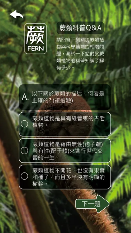 「蕨/FERN」是根據109年科技部科教國合司科普活動計畫: “運用AR/VR技術開發植物生態觀察APP與行動式智能博物館教具之科普計畫”所開發之APP,計畫主持人:王開立,主要是把蕨類科普知識轉化成遊戲化、生活化的互動機制。