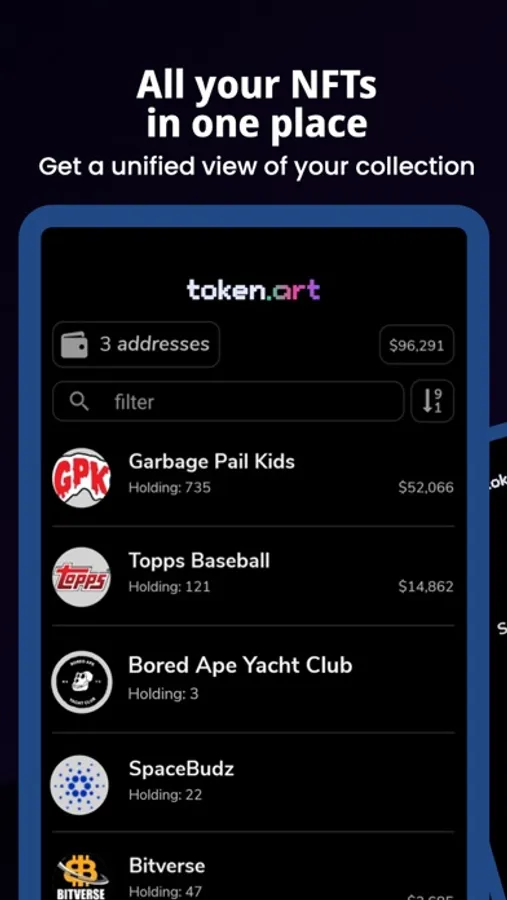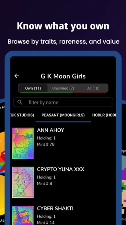 • Search and filter your NFTs by collection, rarity, variant, and more