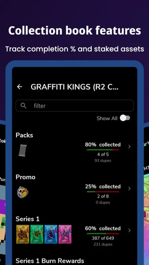 • Toggle between displaying all NFTs in a collection and just the ones you own or are missing