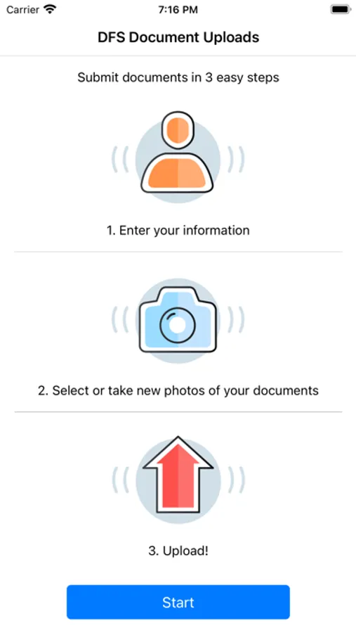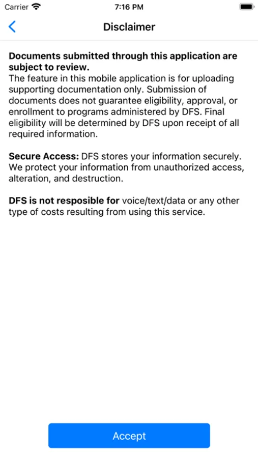 DFS Document Upload is a mobile app that allows clients to upload supporting documentation by taking a photo of each document or by selecting an image from your camera roll for specific DFS programs and services.