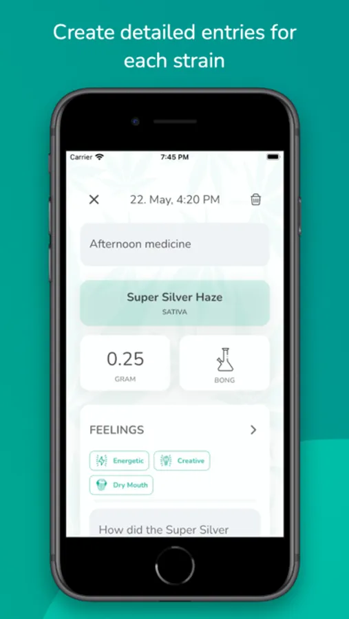 Use the journal to track your cannabis consumption habits. Log relevant details including: strain, phenotype, amount, consumption method, feelings, flavors, and any relevant notes.