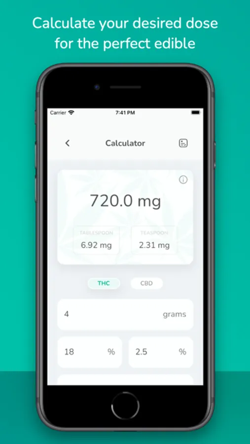 Use the cannabis dosage calculator to create the correct dose for your edible recipes. Simply enter the information (amount of cannabis, THC concentration, CBD concentration, and amount of infusion material) into the calculator and let the app do the work for you!