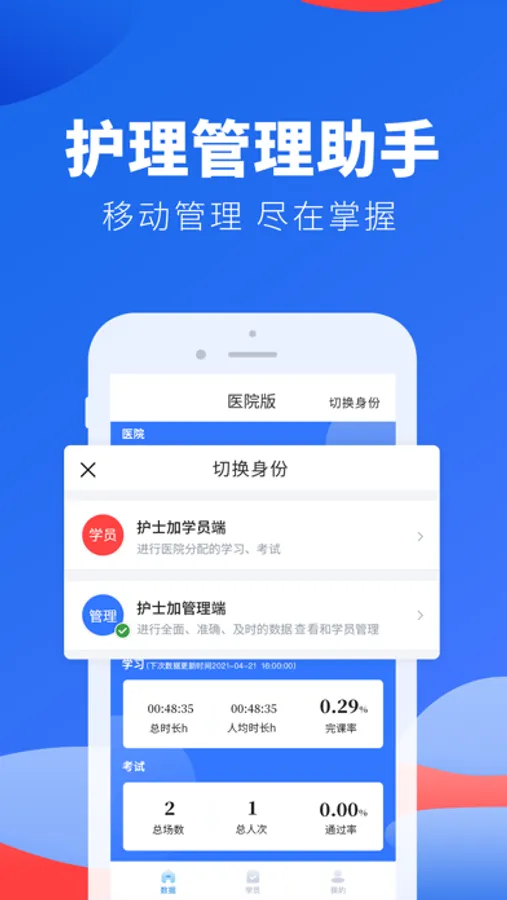护士加医院版为医院护理部/科室提供:护士管理、学习管理、考试管理和数据管理的一站式服务。