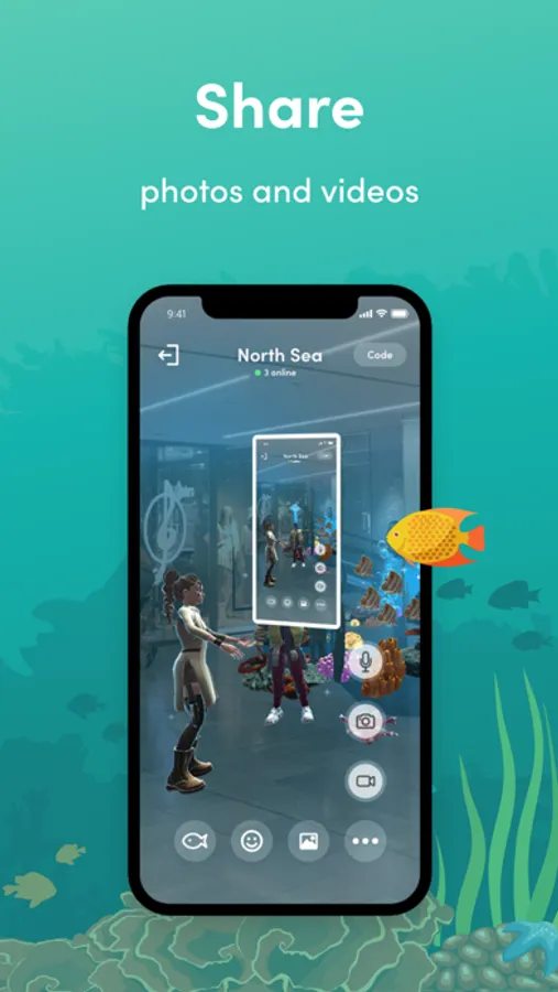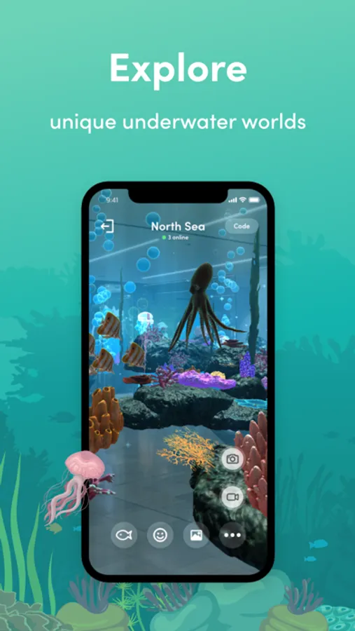Customize your underwater world with the people around you. Communicate through emojis with avatars from all over the world. Take pictures or record videos of you and your friends’ avatars in the app to share on social media.