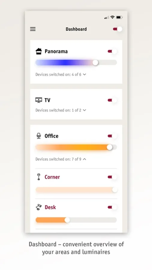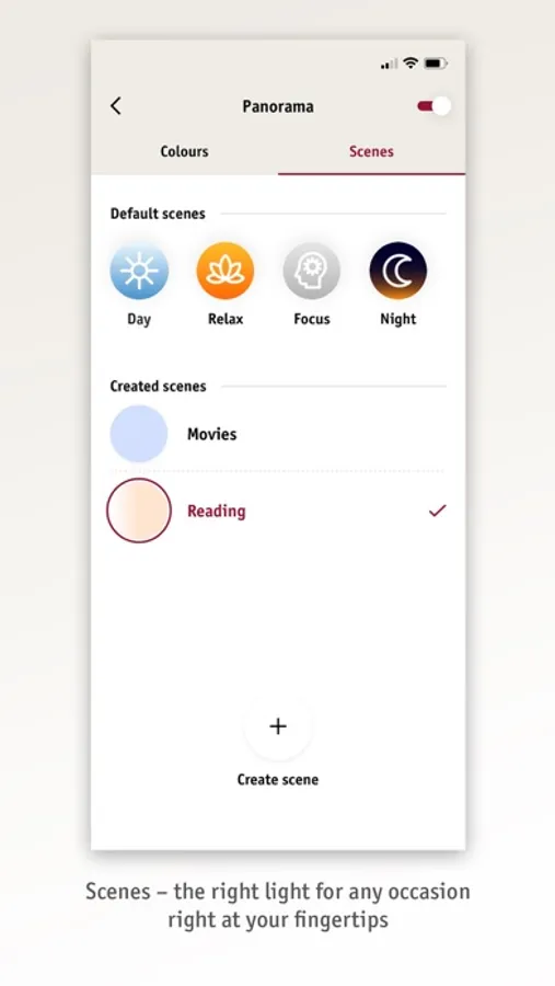 Switching, dimming, colour change – for individual luminaires or several light sources at once: use white hues and millions of colours for your personal lighting experience. Pre-set and user-defined scenes can be accessed quickly to match your mood or your personal daily rhythm. For example: start your day with gentle, warm white light, increase your concentration throughout the day with daylight white illumination, and wind down in the evening with dimmed, relaxing red-orange hues.