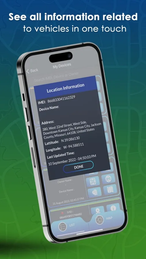 • Get details about the vehicle in use such time of journey, GPS Battery level & signal strength