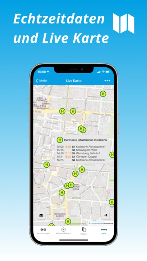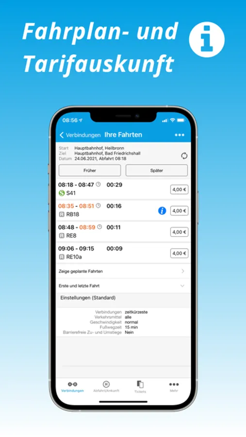 • Tür-zu-Tür Verbindungsauskünfte in Echtzeit (umfangreiche Einstellungsmöglichkeiten (u. a. Verkehrsmittel, Fahrradmitnahme, Fußwege, Steigungen u.v.m.)