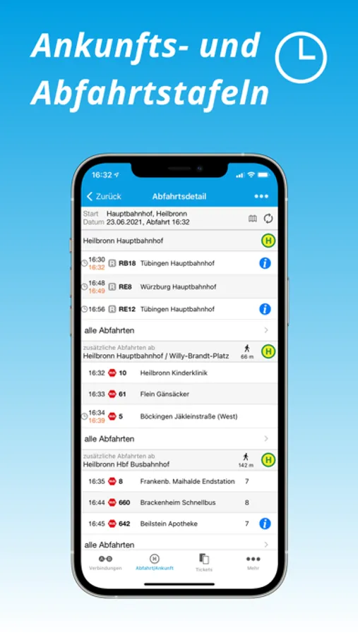 • Abfahrts- bzw. Ankunftstafel inkl. Möglichkeit, Echtzeitabfahrten bzw. -ankünfte mehrerer Haltestellen in der Umgebung gleichzeitig anzuzeigen