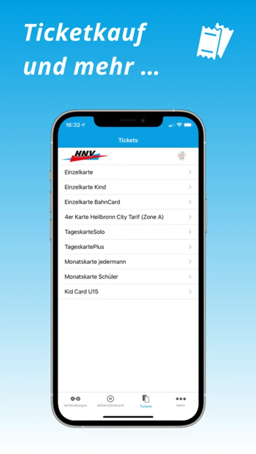 • Ticketkauf (Einzelkarte für Erwachsene, Kinder und mit BahnCard Ermäßigung, 4er Karte für den City Tarif Heilbronn, Tageskarten, Monatskarten für Jedermann und Schüler)