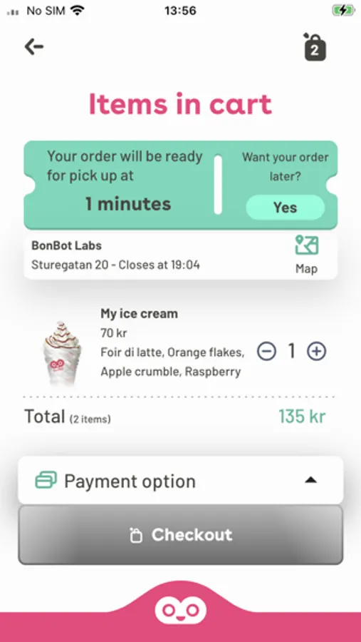 The BonBot app is your soft serve cafe in your pocket! Use it to create a delicious bespoke premium soft serve at a good price and our robot will prepare it for you. As simple as that. When you pick it up the app will be the way to unlock the box where your culinary order is place by the robot.